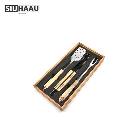 Accesorios de acero inoxidable para barbacoa, juego de herramientas de parrilla con caja de madera, 3 piezas, gran oferta